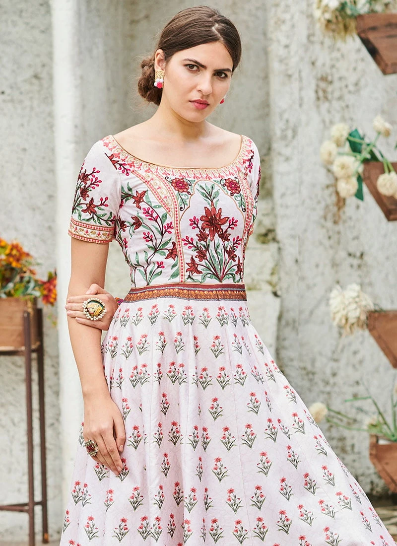 This pink art silk anarkali gown is adding the beautiful glamorous displaying the sense of cute and graceful. You could see some intriguing patterns carried out with embroidered, stones and printed work.