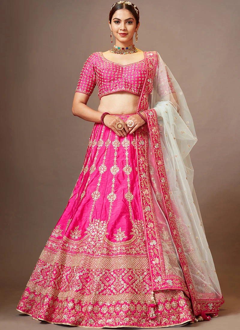 Pink Color Pure Silk Embroidered And Zari Work Umbrella Lehenga Wedding Wear