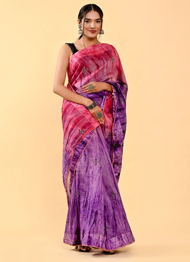 Pink N Purple Cotton Sequins Work Saree Festive Wear