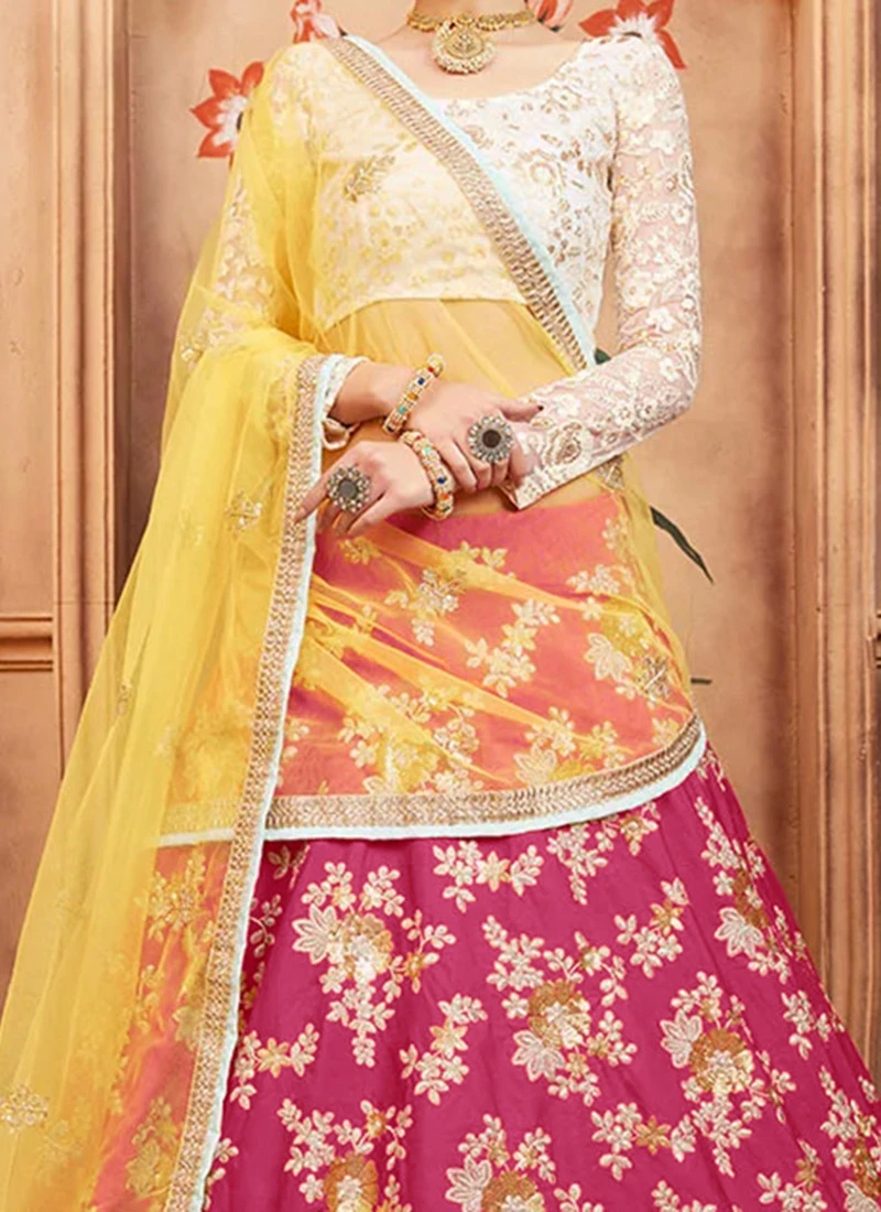 This product consists of semistitched lehenga, choli and dupatta fabric. This can be stitched using the custom tailoring options below. To buy semi-stitched fabric, just choose the unstitched option.