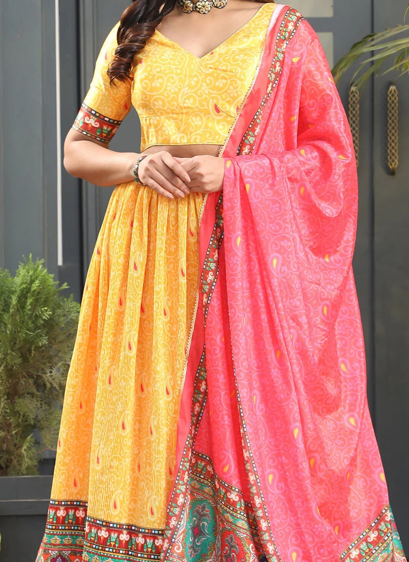 Comes with semi -stitched lehenga, un stitched choli and dupatta fabric. To have it stitched, please select the custom tailoring options. Lehenga with elaborate patterns and colors are used for photo-shoot. Color and pattern of the lehenga might not be as shown in the image.