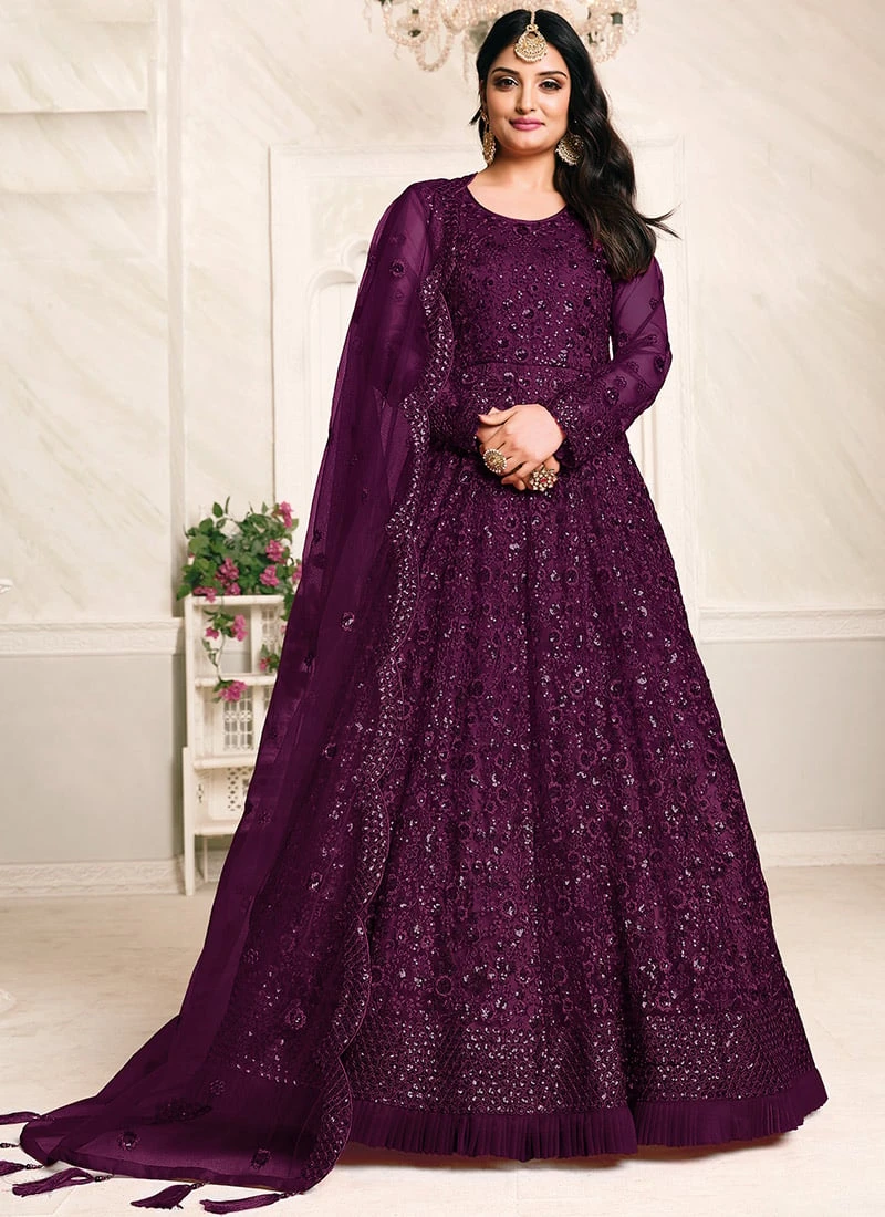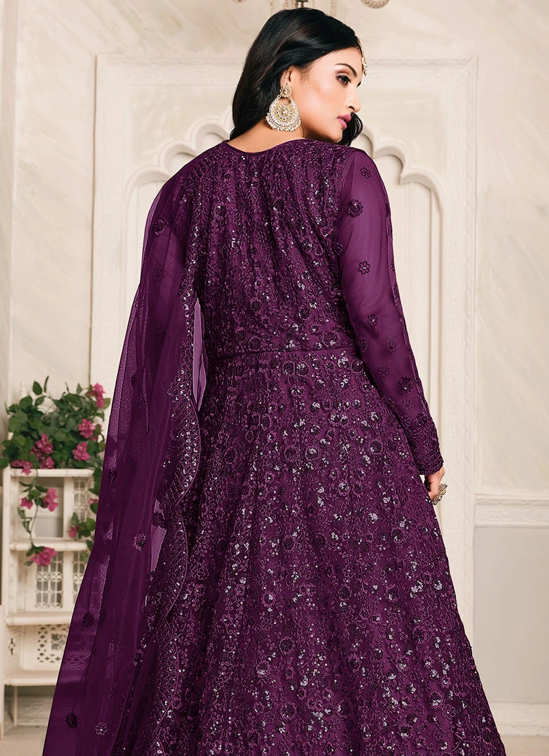 Purple Net Anarkali Suit Party Wear