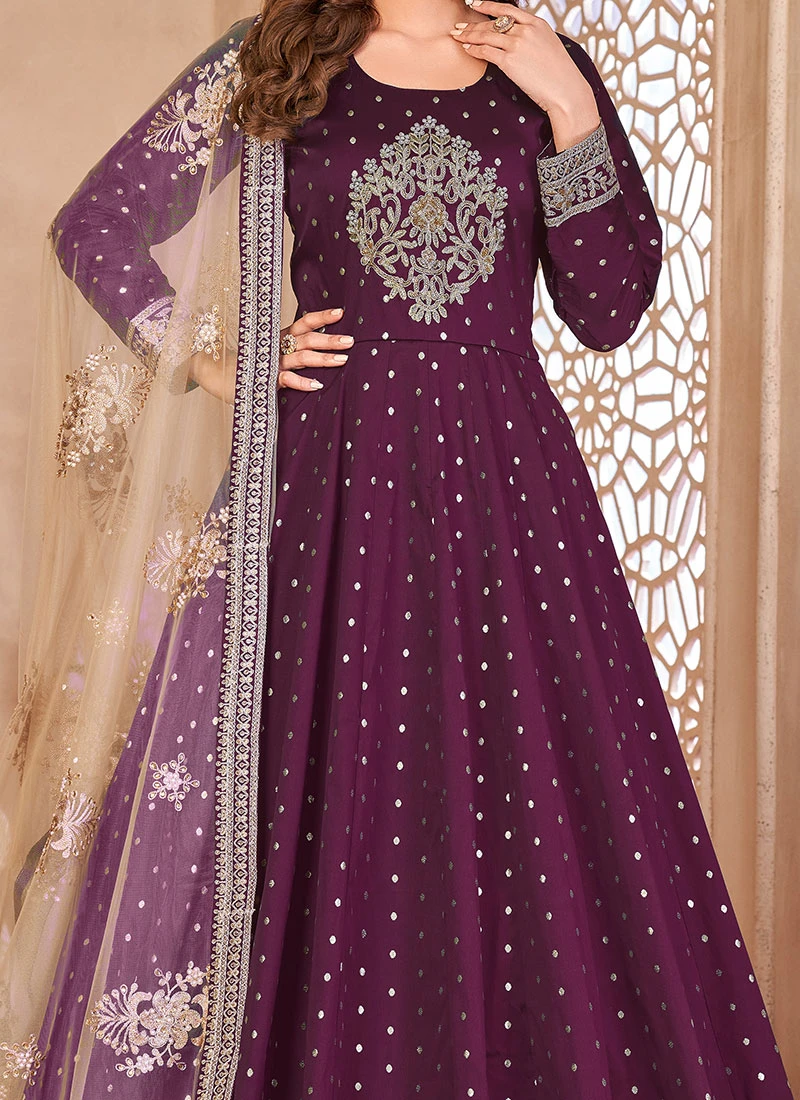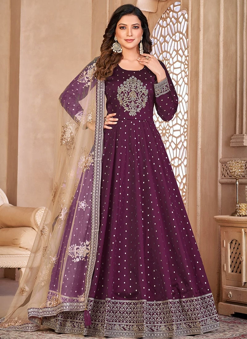 Purple Taffeta Embroidered Stones Anarkali Suit Party Wear