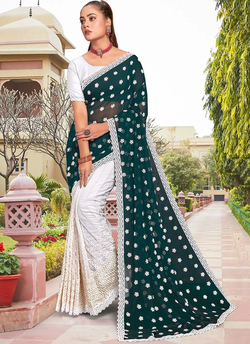 Comes with unstitched blouse fabric. To have the blouse stitched, please select the custom tailoring options. Blouses with elaborate patterns and colors are used for photo-shoot. Color and pattern of the blouse might not be as shown in the image.