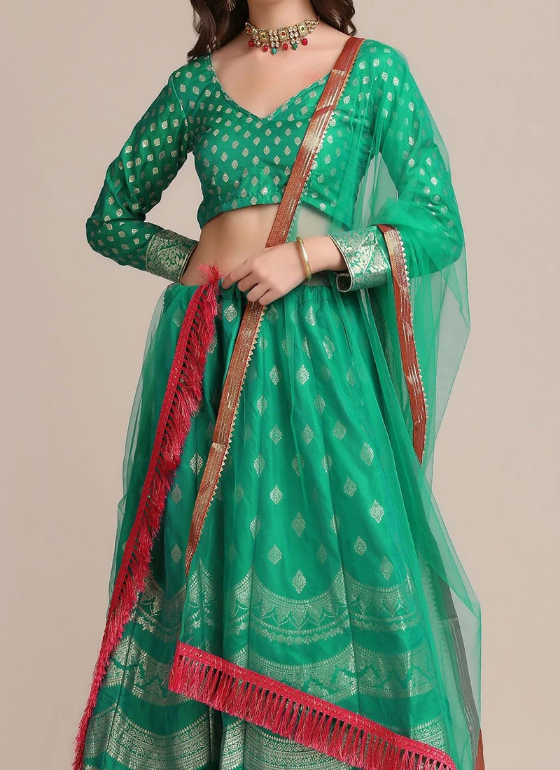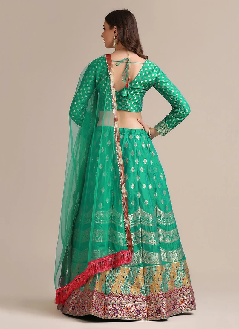 Rama Green Silk Zari Jacquard Weaving Work A Line Lehenga Party Wear