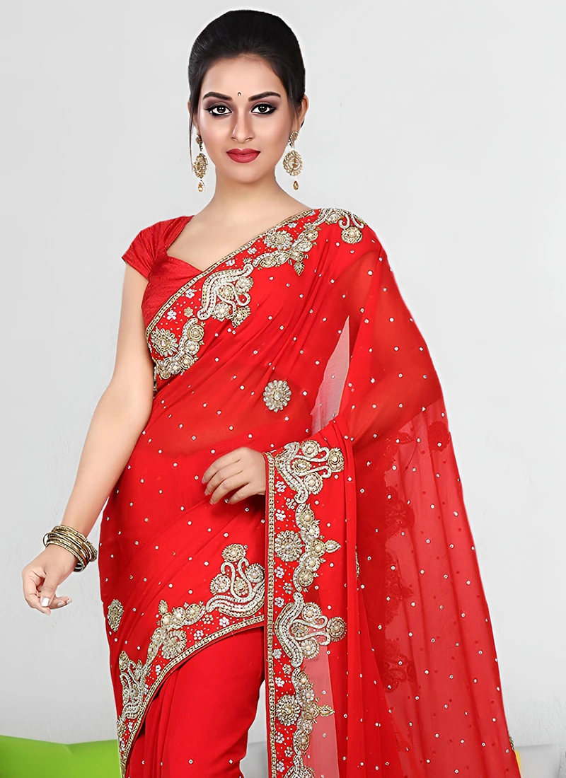 Crafted from highquality faux georgette fabric this saree is known for its lightweight flowy drape and soft texture. The luxurious red colour exudes sophistication and regality making it a popular choice among fashionconscious women.