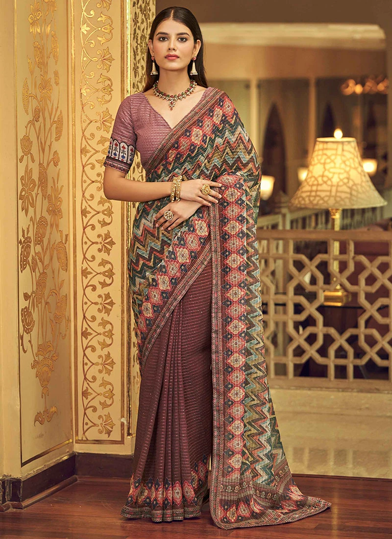 Rose Gold Pink Georgette Printed Work Half N Half Saree Party Wear