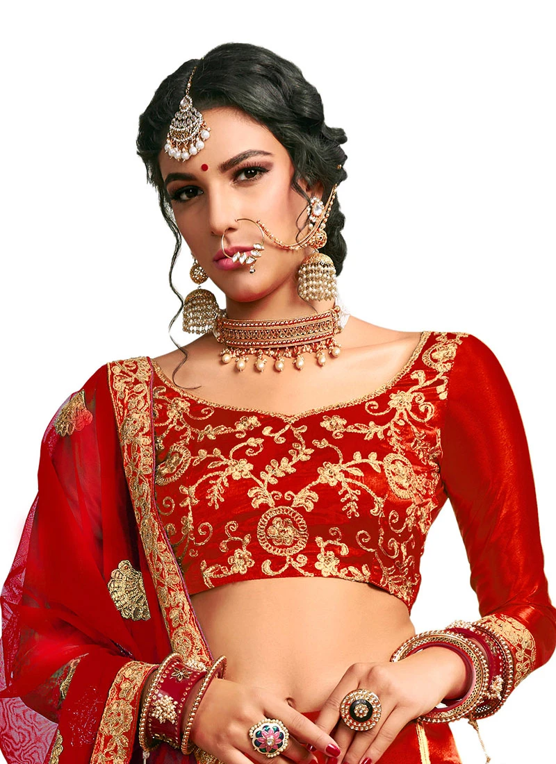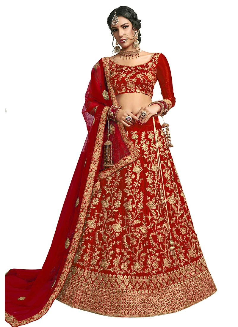 Scarlet Red Satin Silk Embroidered Umbrella Lehenga Party Wear