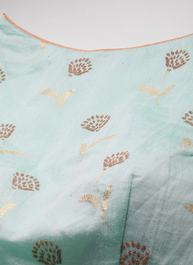 Presentinga sea blue cotton and blue lehenga set, features a sea blue cotton blouse till natural waist length, with boat neckline in the front and low neckline with tassels detailing closure in back,side zipper opening, elbow sleeve with trim detailing.The blouse comes with detachable belt with nice trim.The sea blue cotton bottom is of the contoured waist band with hooks and zipper opening , bottom comes with medium flare till floor length.It is paired up with blue embroiderer net dupatta adorned with borders on all four sides.Mask only for shoot purposes.Refer the fabric image for true color of the dress. This dress is custom designed from fabric and custom stitched. Once sold cannot be returned.Designs, colors, and patterns on the actual product may slightly vary from designs shown in the image. Images are the only representative