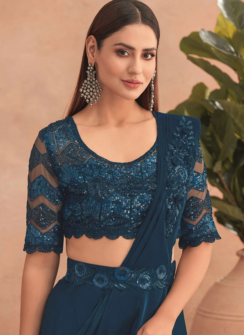 Teal Blue Chinon Silk Embroidered Ready Pleated Saree Party Wear
