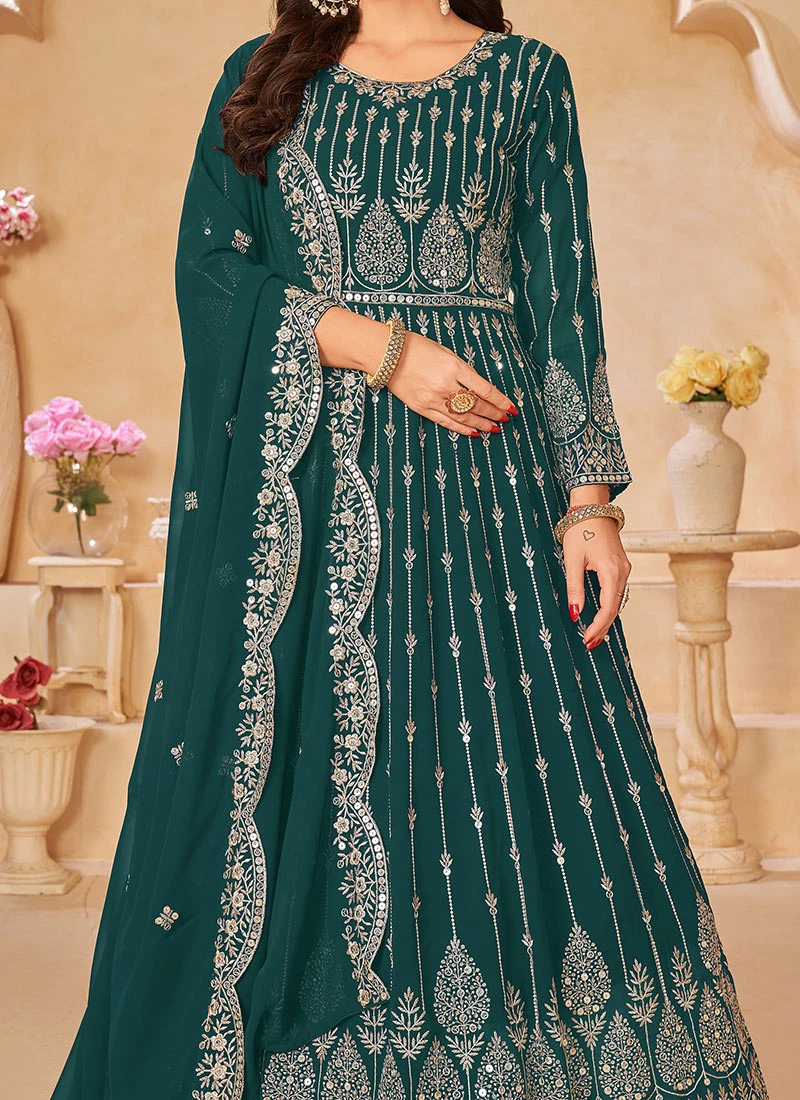 This Teal Green Faux Georgette Embroidered Anarkali Suit is a versatile choice suitable for weddings parties festive gatherings and other special events. It effortlessly combines traditional elements with contemporary aesthetics making it a timeless addition to any womans ethnic wardrobe.
