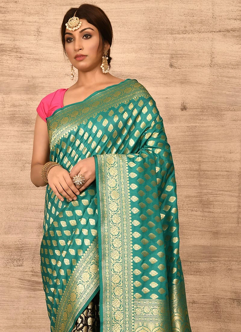 Teal N Black Banarasi Katan Zari Weaving Half N Half Saree Festive Wear
