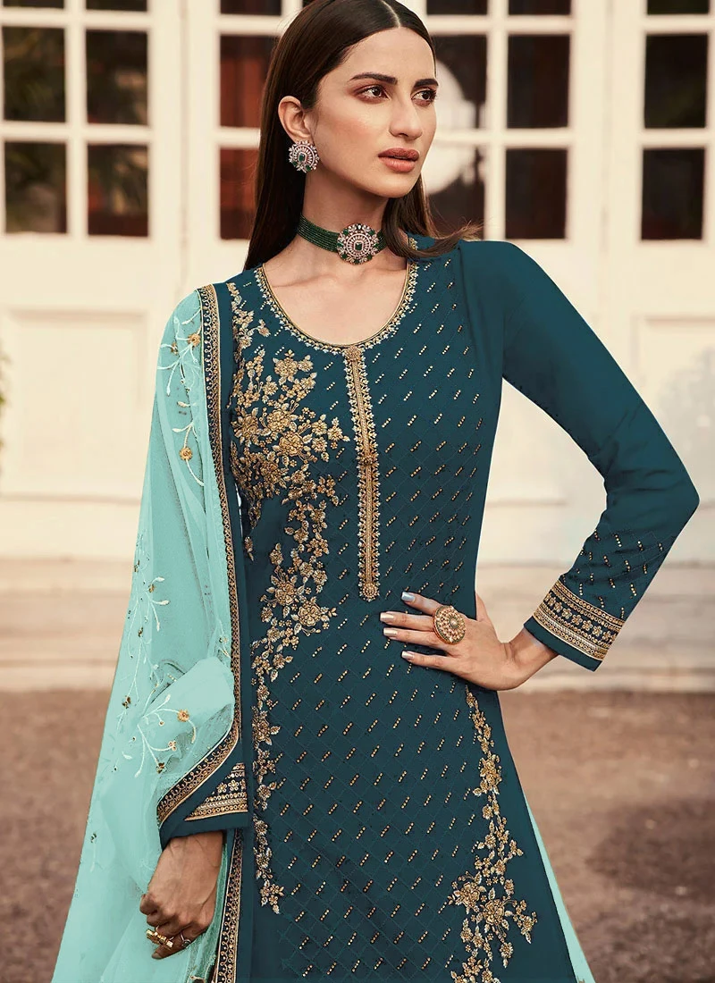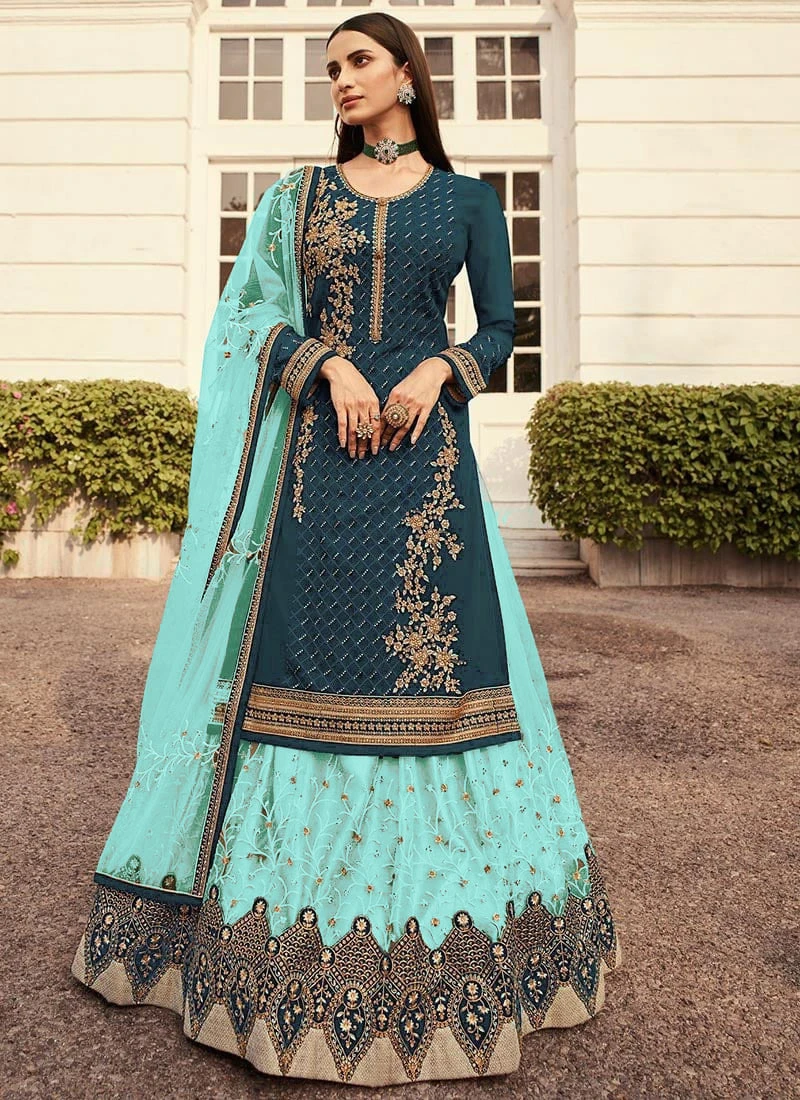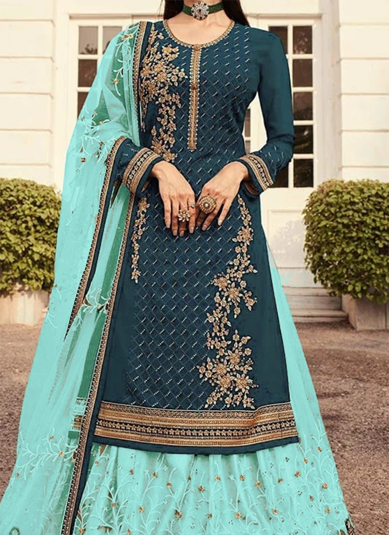 Turquoise Net Embroidered N Stones Long Choli Lehenga Party Wear