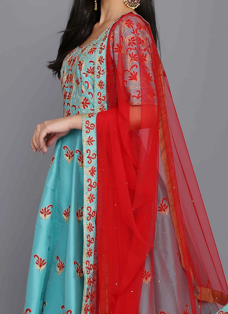 Be the sunshine of everyone eyes dressed in this pretty turquoise taffeta silk anarkali suit. This lovely kameez comes with aari thread work on the dress and crafted with round neck and elbow sleeves looks chic. This suit comes with turquoise shantoon chudi pant bottom and red color net dupatta.hudi pant bottom and red color net dupatta.