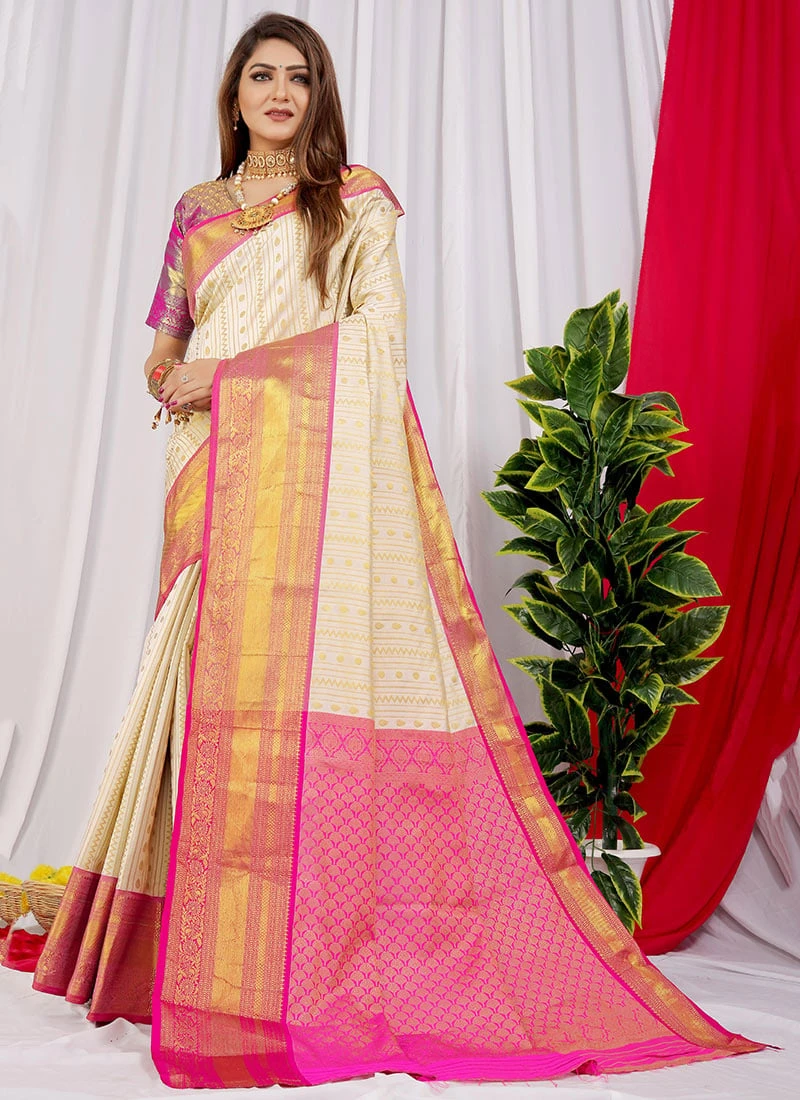 Weaving Work White Color Soft Litchi Silk Saree Festive Wear