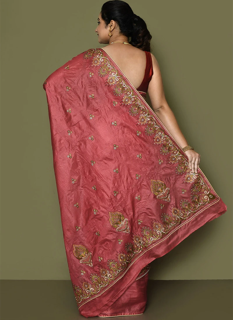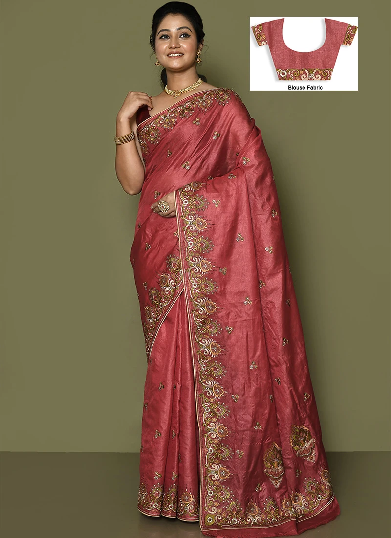 Comes with unstitched blouse fabric. To have the blouse stitched, please select the custom tailoring options. Blouses with elaborate patterns and colors are used for photo-shoot. Color and pattern of the blouse might not be as shown in the image.
