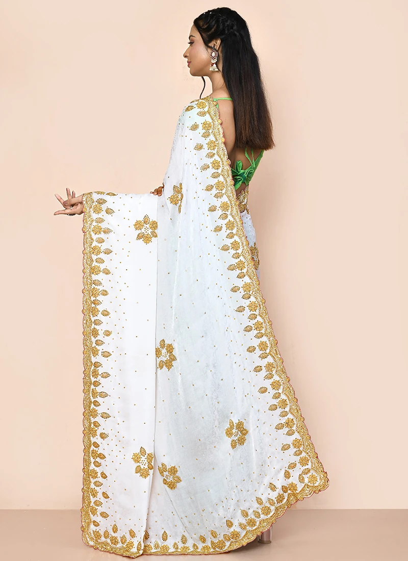 In summary our WhiteGreen Faux Georgette Hand Work Sari is a testament to the rich heritage of Indian textiles and craftsmanship. Its timeless design combined with meticulous handwork makes it a symbol of elegance and sophistication. Whether youre celebrating a special occasion or attending a festive event this sari is guaranteed to enhance your beauty and leave a lasting impression on everyone around you. Experience the magic of traditional Indian artistry with this exquisite handcrafted masterpiece.