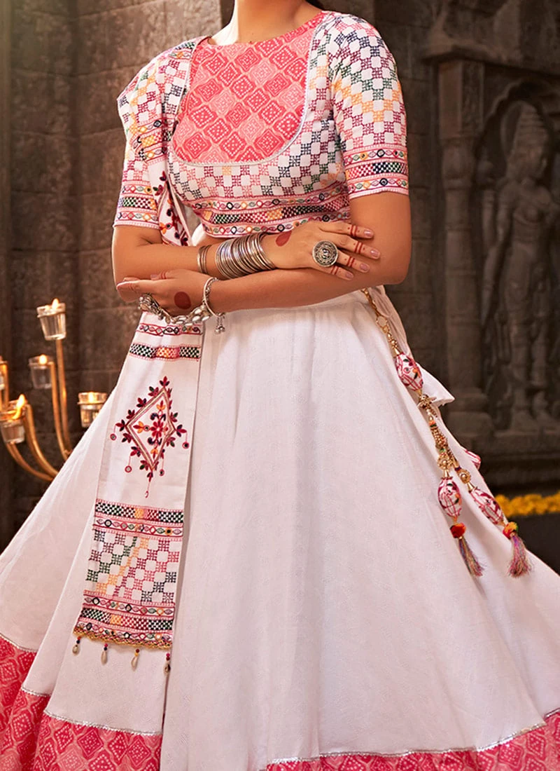 Step into the world of timeless elegance and cultural richness with our White Blended Cotton Printed Kutch Work Chaniya Choli. This exquisite ensemble is a celebration of traditional Indian craftsmanship combining intricate Kutch embroidery with the comfort and grace of blended cotton fabric. Whether youre attending a festive occasion a traditional wedding or simply want to embrace your cultural heritage this Chaniya Choli is the epitome of ethnic charm.