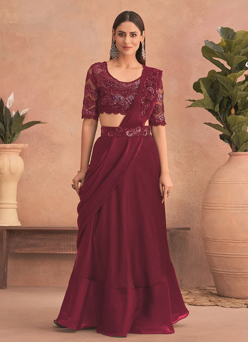 Comes with unstitched blouse fabric. To have the blouse stitched, please select the custom tailoring options. Blouses with elaborate patterns and colors are used for photo-shoot. Color and pattern of the blouse might not be as shown in the image.