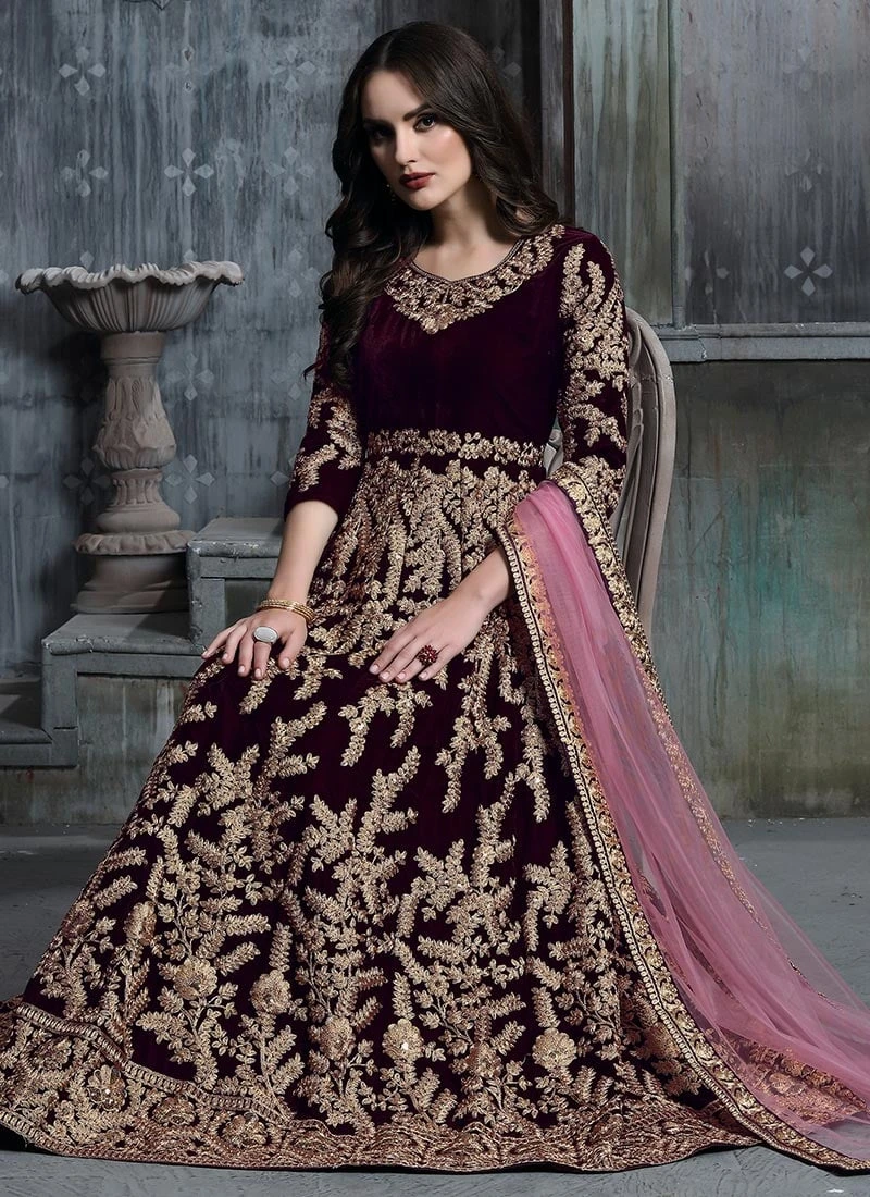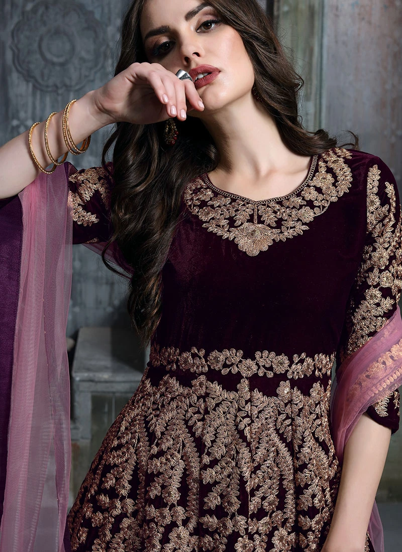 Wine Embroidered Abaya Style Anarkali Suit Party Wear