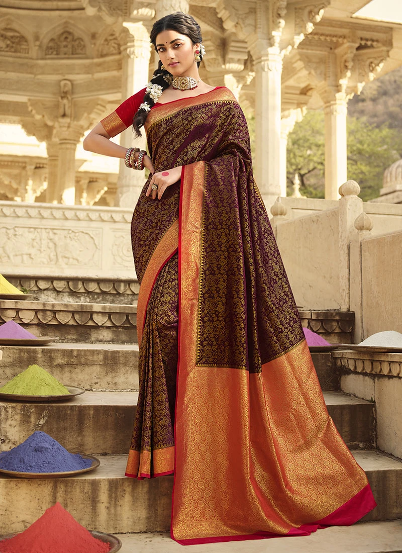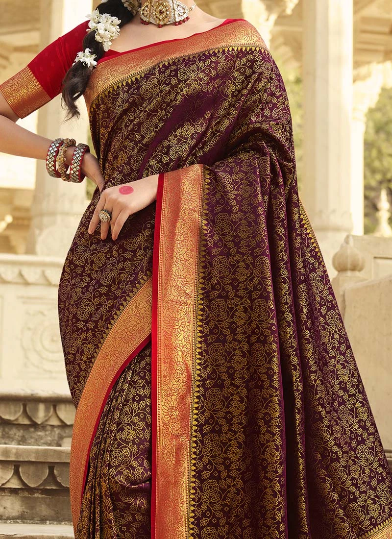Wine Katan Silk Weaving Work Saree Festive Wear