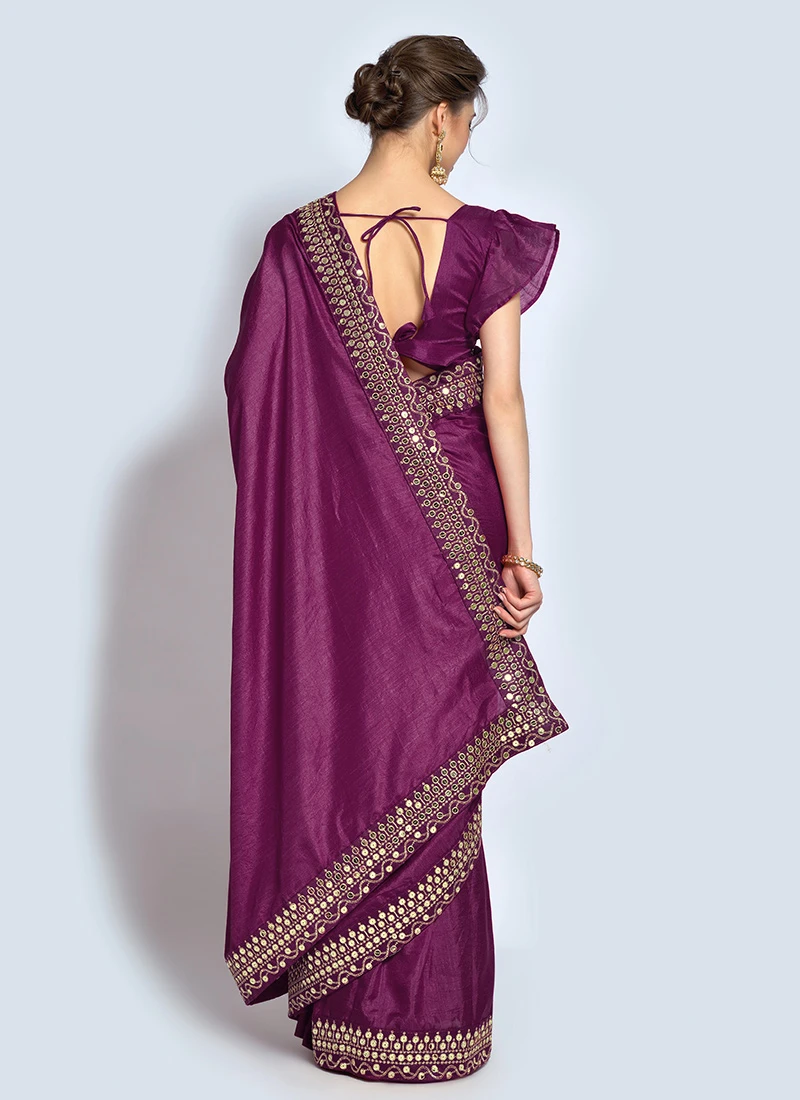Wine Vichitra Silk Embroidered Saree Party Wear