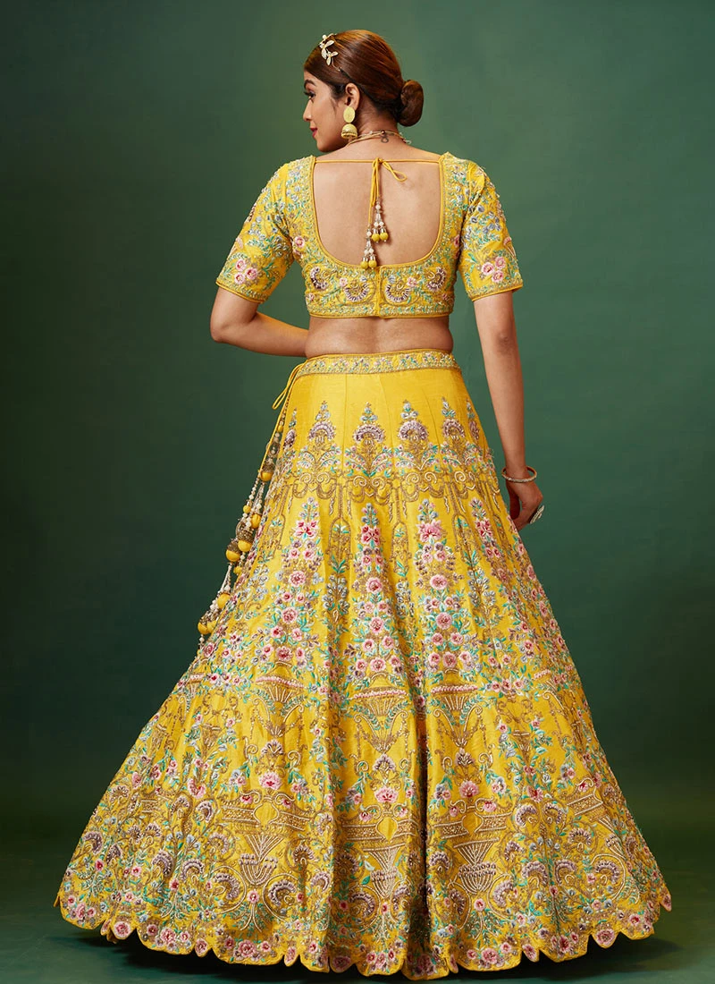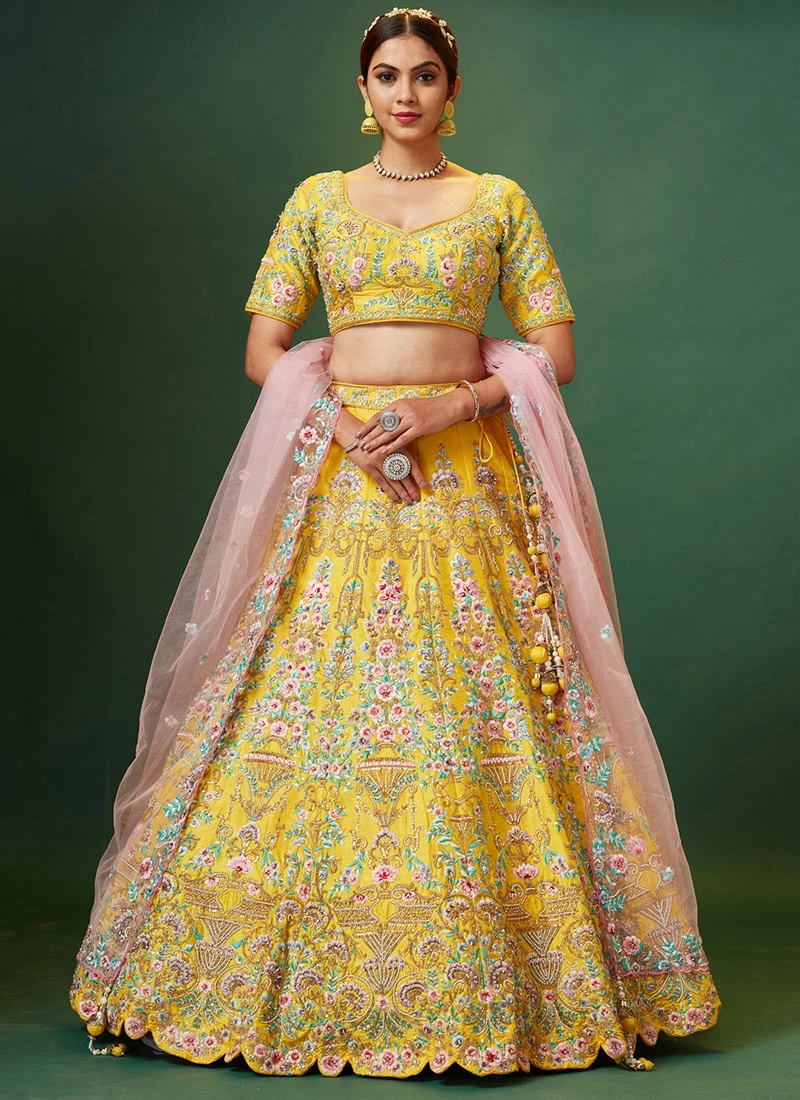 Comes with semi -stitched lehenga, un stitched choli and dupatta fabric. To have it stitched, please select the custom tailoring options. Lehenga with elaborate patterns and colors are used for photo-shoot. Color and pattern of the lehenga might not be as shown in the image.