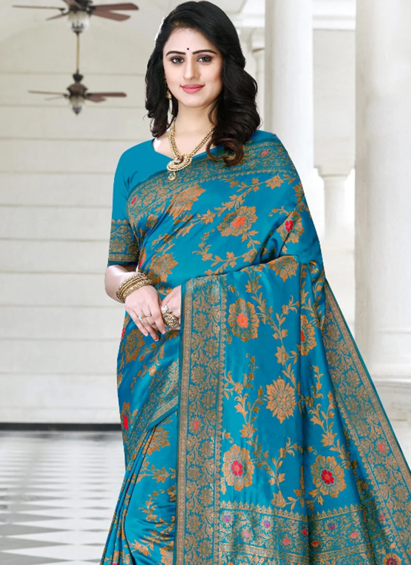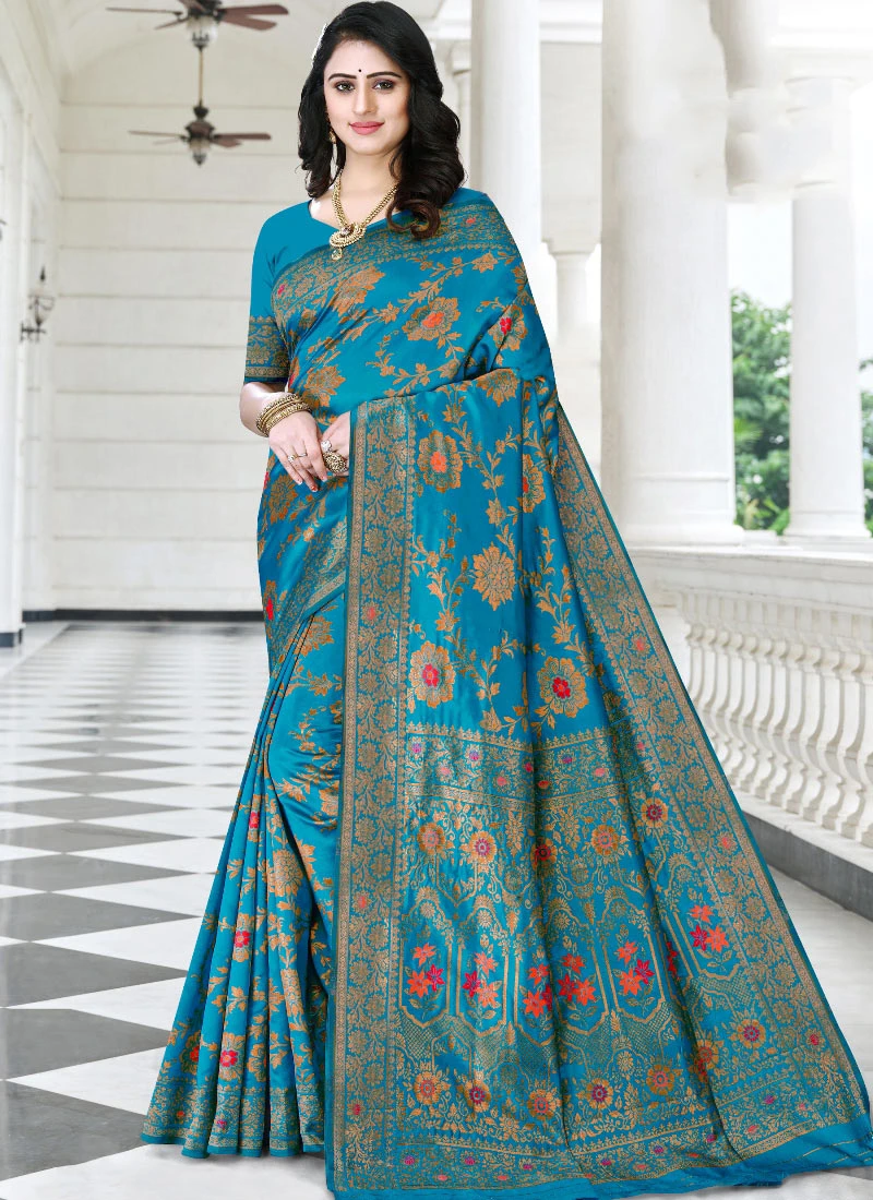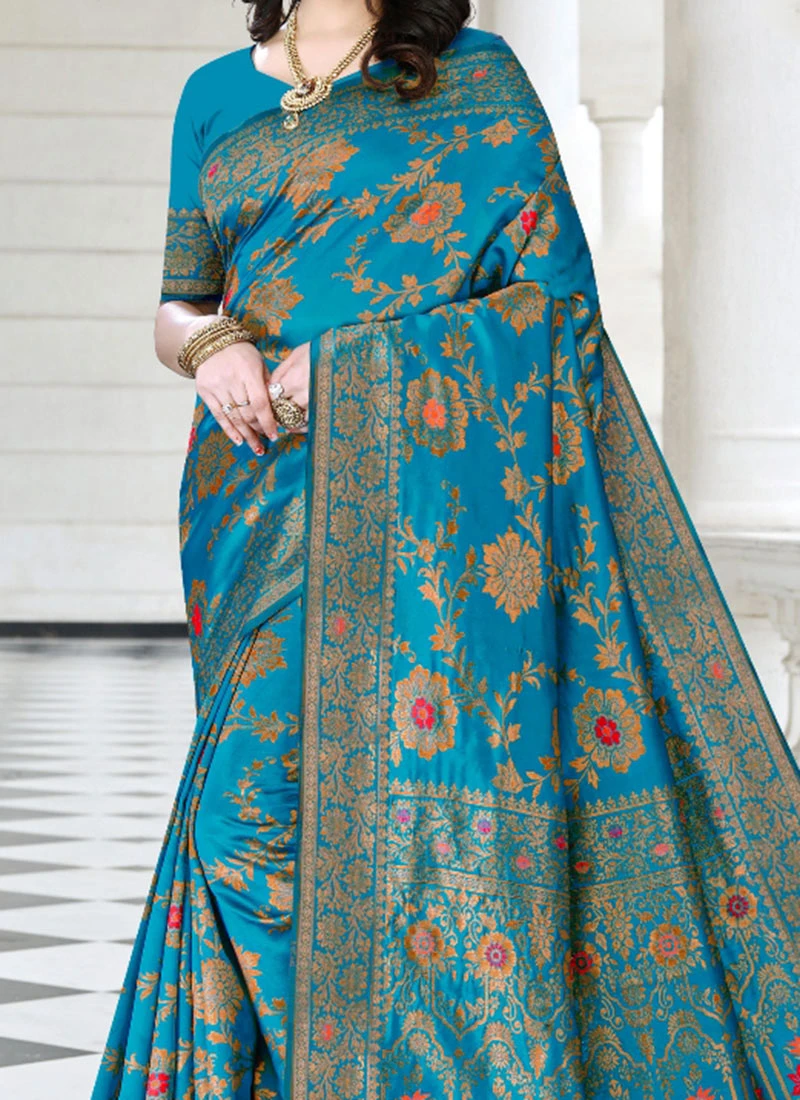 Zari Work And Meenakari Work Light Blue Color Litchi Silk Saree Festive Wear