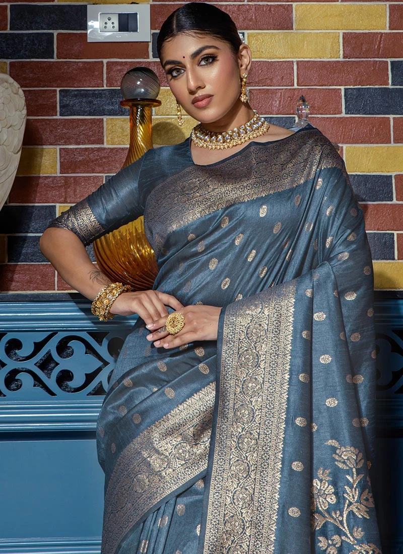 Zari Woven Work Banarasi Raw Silk Grey Color Saree Festive Wear